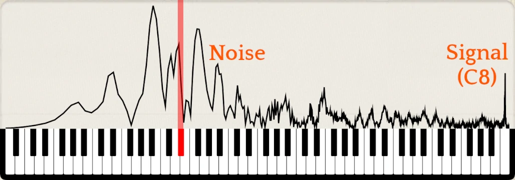 The peak from the note being played is tiny compared to the lower frequency peaks from the percussive action noise from the key strike. The tone of the note, from the app’s perspective, is being drowned out by the “thwack” of your finger hitting the key, the key hitting the bottom of the keybed, and the hammer ricocheting off the piano strings. The weak and quickly decaying signal amid all this extra noise makes it hard for PianoMeter to reliably detect that C8 is being played in the first place.